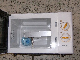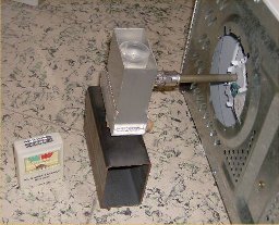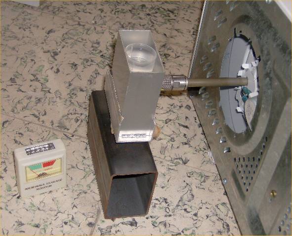 A waveguide to coax adapter made in site is placed in the microwave, Photo 2, very near the microwave waveguide. The connection should be electrically continuous but it is only a test and it will be well fitted in the future. The waveguide to coax adapter is made with a simple aluminium rectangular tube of 80 x 40 x 1.5 mm ext. The waveguide wave length Lg, by chance is exactly 5.0 cm. A brass conical probe, 3cm length, is situated at that distance from the short. The coaxial cable passes through the hole for the motor of the microwave.