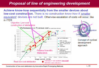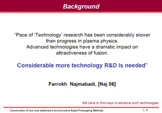 Seminar about construction methods, UST_2 and reactors given in 'National Fusion Laboratory' , CIEMAT, 2010See the presentation (pdf , English , 2MB): On 15st November 2010 the seminar 'Construction of low-cost stellarators by Innovative Rapid Prototyping Methods. Discussion of possible benefits for experimental and theoretical fusion' was given by Vicente M. Queral in the NFL 'National Fusion Laboratory', CIEMAT. This seminar was given for the physicist's group in LNF. The studies for the presentation were carried out almost exclusively during my spare time (nights and weekends) as I was working in Remote Handling for ITER, IFMIF and DEMO. Consequently the accuracy and detail of the presented results is low. Three slices of the presentation are shown next: